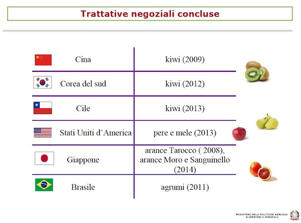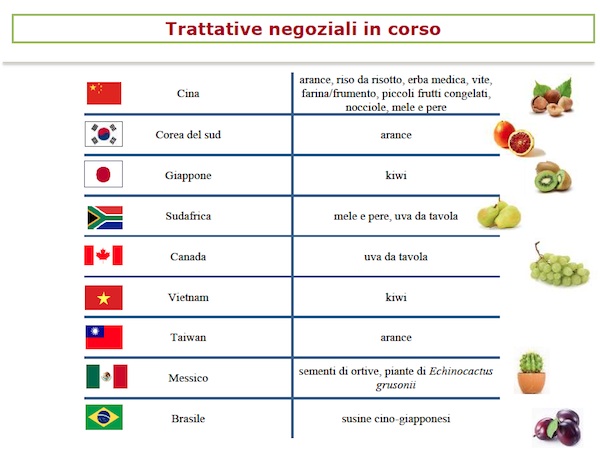 Di particolare interesse le trattative in corso, che hanno nei mercati asiatici il principale riferimento: si sta lavorando con la Cina per arance, piccoli frutti, pomacee e nocciole; con la Corea del Sud e Taiwan per le arance; con il Giappone ed il Vietnam per il kiwi. Per le Americhe, lavori in corso con il Canada per l'uva da tavola, con il Messico per le sementi di ortive e con il Brasile per le susine cino-giapponesi. Infine il Sudafrica: oggetto della trattativa, mele, pere e uva da tavola.
