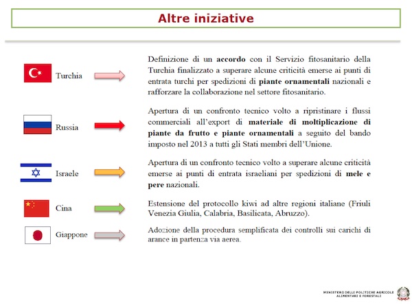 Tra le altre iniziative in corso, spicca il confronto tecnico con la Russia volto a ripristinare, dopo la dichiarazione dell'embargo, i flussi commerciali di materiale di moltiplicazione di piante da frutto e piante ornamentali; ma si punta a superare criticità per le spedizioni di pomacee in Israele e ad estendere il protocollo kiwi con la Cina ad altre regioni italiane.