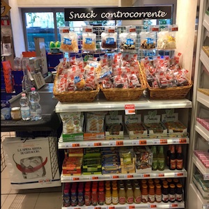 Il bancone di “snack controcorrente” (che si affianca, per inciso, a un reparto ortofrutta impattante e di buon livello) propone succhi, referenze Melinda a base di mele, frutta secca e non: un’iniziativa lodevole, che da tempo Italiafruit News aupica possa diffondersi adeguatamente e alla quale, di conseguenza, auguriamo le migliori fortune.