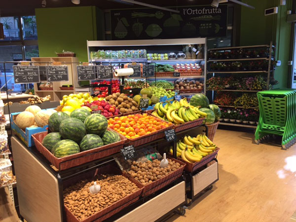 Il reparto ortofrutta, collocato all'ingresso del negozio
