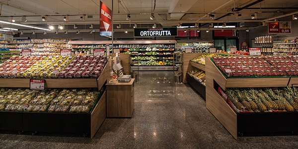 Grande attenzione per il reparto ortofrutta, progettato con innovative soluzioni nei layout: nuovo, così come già sperimentato nelle recenti aperture in Puglia e Calabria, il modello espositivo caratterizzato dalla presenza di banchi frigo refrigerati con esposizione verticale.