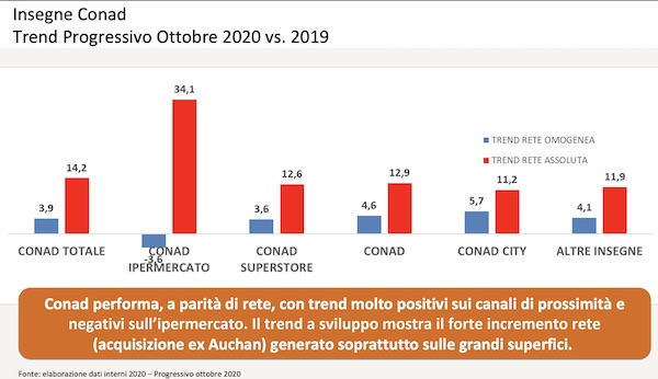Tornando ai numeri, la crescita del fatturato non ha riguardato tutti i 3.816 punti di vendita, di cui 182 del distributore francese: il trend è stato molto positivo, a parità di rete, per i canali di prossimità (anche se a ottobre si sta ridimensionando) e i concept; negativo per gli ipermercati. La pressione promozionale è calata dell'1%.