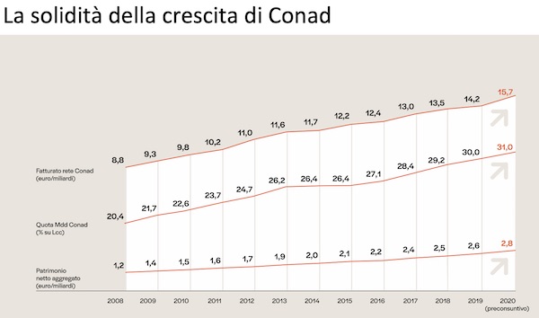 Negli ultimi 10 anni, il giro di affari di Conad è aumentato del 61% e la sua quota di mercato è cresciuta di 5 punti percentuali a conferma della leadership raggiunta lo scorso anno.