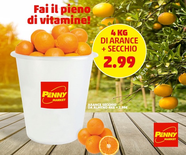 "Secchiate d'arance" da Penny Market. Nel reparto ortofrutta del discounter spiccano in questi giorni secchi trasparenti di grandi dimensioni che contengono quattro chili di agrumi italiani al prezzo di 2,99 euro. L'insegna del gruppo Rewe non è nuova a proposte di questo tipo che sicuramente calamitano l'attenzione per la loro originalità. Ma, ancora una volta, salta all'occhio l'esiguo valore attribuito al prodotto, tra l'altro rigorosamente Made in Italy, venduto a 75 centesimi il chilogrammo. Secchio compreso.