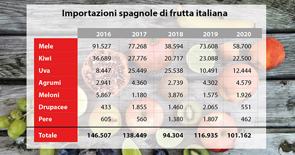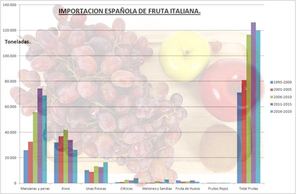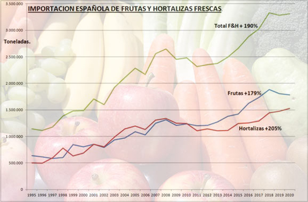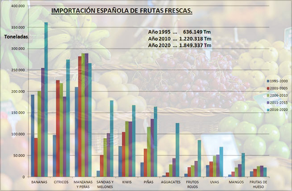 Importazioni spagnole di frutta fresca: anno 1995 pari a 636.149 tonnellate, anno 2010 pari a 1.220.318 tonnellate, anno 2020 pari a1.849.337 tonnellate