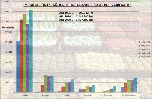 Importazioni spagnole di ortaggi freschi per varietà: anno 1995 pari a 500.712 tonnellate, anno 2010 pari a 1.243.790 tonnellate, anno 2020 pari a 1.527.597 tonnellate.