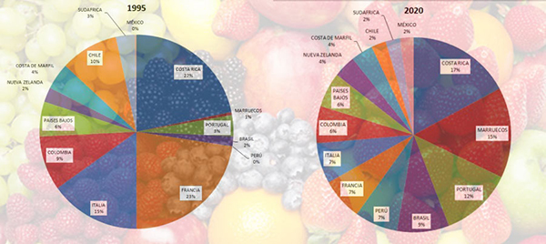 Relativamente ai frutti esotici, ananas, avocado e mango hanno cononosciuto una crescita esponenziale, tant'è che i volumi totali sono passati dalle 35mila tonnellate nel 1995 alle 395mila tonnellate nel 2020. Gli ananas arrivano principalmente dalla Costa Rica, i mango per il 60% dal Brasile e per il 25% dal Perù, gli avocado per il 46% dal Perù, per l'8% dal Marocco mentre Cile e Colombia mantengono una quota del 6%.