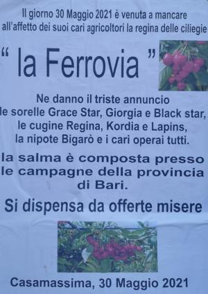 Così nasce il malcontento e scoppia la protesta, come è successo ieri mattina a Casamassima (Bari), dove in paese sono comparsi manifesti a lutto per la ciliegia Ferrovia.