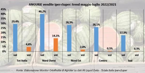Passando nel Nord-Est i quantitativi venduti da maggio a luglio sono il 2% in più rispetto allo scorso anno, ma a valore il dato è del 28,3% più alto. Scendendo lungo lo Stivale, poi, i quantitativi di cocomeri venduti è praticamente lo stesso del 2021: +0,5% al Centro e +0,3% al Sud, ma a valore il dato è rispettivamente del +26,1% e del +17,3%.