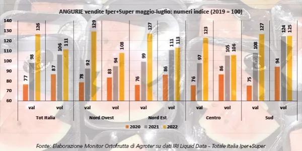 Nella campagna angurie 2022 – in attesa dell’importante dato di agosto – c’è stata quindi un’importante accelerazione delle vendite rispetto agli ultimi tre anni. Fatto cento il dato del trimestre maggio-giugno-luglio 2019, i quantitativi di frutti veicolati nei canali della distribuzione moderna nell'analogo periodo sono diminuiti durante i due anni di pandemia: nel 2020 a livello nazionale erano sprofondati di 13 punti (mentre a valore addirittura di 23), lo scorso anno c’è stato un rimbalzo positivo (volumi su di 6 punti, mentre a valore lo scarto col 2019 è stato limitato a 2 punti); mentre quest’anno sui quantitativi si guadagnano 11 punti rispetto all’ultimo anno prima della pandemia e a valore, invece, la differenza rispetto alla campagna di tre anni fa è di 26 punti.
