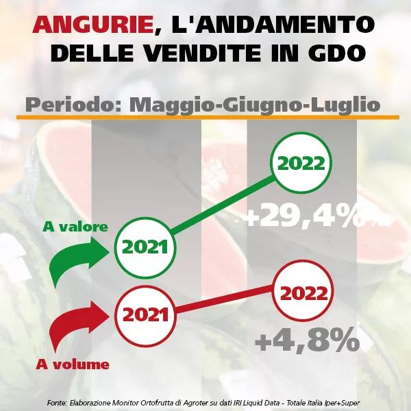 La campagna angurie fa segnare numeri di tutto rispetto nella distribuzione moderna italiana. Dall’esordio commerciale di maggio, passando per giugno e luglio, le vendite a volume fanno segnare un incremento del 4,8% rispetto all’analogo trimestre del 2021, mentre a valore è stato messo a segno un aumento del 29,4%. Segno che il prezzo medio della referenza è cresciuto, un fenomeno inflattivo presente in reparto, ma che per questo prodotto risulta marcato. Secondo i dati elaborati dal Monitor Ortofrutta di Agroter, infatti, nel primo semestre dell’anno le vendite di ortofrutta in Gdo sono cresciute dello 0,9% a valore a fronte di un calo dei quantitativi venduti del 5,6% sullo stesso periodo 2021.