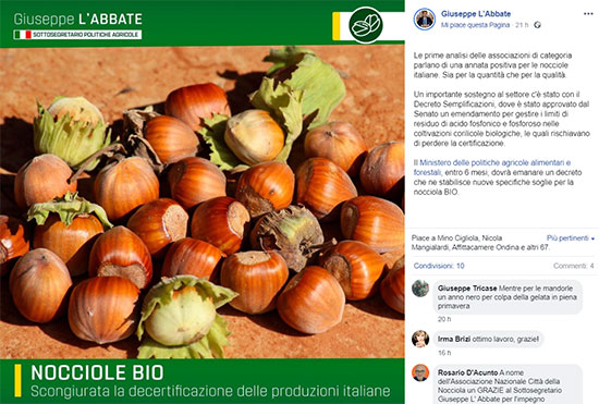 Il Sottosegretario L'Abbate, da parte sua, ieri ha colto l’occasione per annunciare pubblicamente la nuova normativa, commentando così la partenza della campagna corilicola: "Le prime analisi delle associazioni di categoria parlano di una annata positiva per le nocciole italiane, sia per la quantità che per la qualità - ha scritto in un post su Facebook - Un importante sostegno c'è stato con il Decreto Semplificazioni, dove è stato approvato dal Senato un emendamento per gestire i limiti di residuo di acido fosfonico e fosforoso nelle coltivazioni corilicole biologiche, le quali rischiavano di perdere la certificazione. Il Ministero delle politiche agricole alimentari e forestali, entro 6 mesi, dovrà emanare un decreto che ne stabilisce nuove specifiche soglie per la nocciola bio".
