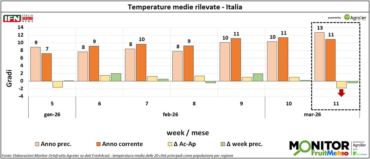 Le analisi del Monitor Ortofrutta si arricchiscono grazie a una nuova collaborazione dedicata a esplorare settimanalmente una variabile spesso decisiva per il settore ortofrutticolo: il meteo. Tra i diversi fattori che influenzano le condizioni climatiche, questa nuova rubrica si concentra in particolare sulle temperature medie registrate lungo la Penisola, con il supporto di Fresh4cast, una piattaforma software in cloud specializzata nella previsione della domanda e nell'ottimizzazione della supply chain per il settore ortofrutticolo.