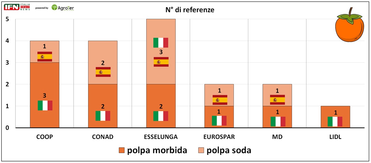 In generale, i cachi a polpa morbida provengono tutti da produzioni italiane, mentre quelli a polpa soda sono per lo più di origine spagnola, con l’unica eccezione di una referenza italiana disponibile da Esselunga.