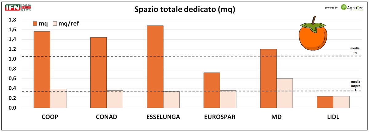Lo spazio dedicato ai cachi è piuttosto limitato, sia per l’assortimento ridotto rispetto ad altre categorie, sia per controllare al meglio le rotazioni, considerando la breve shelf life del prodotto, in particolare di quello a polpa morbida. MD è l’insegna che destina il maggior spazio medio per referenza, mentre nelle altre catene questo valore risulta sostanzialmente allineato.
