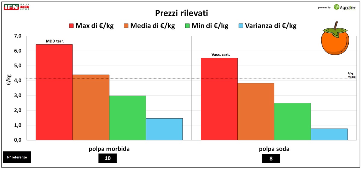 L’analisi dei prezzi evidenzia un livello medio-alto, pari a circa 4 €/kg nel complesso, leggermente superiore per i cachi a polpa morbida – così come anche la variabilità dei prezzi - e inferiore per quelli a polpa soda. Il valore massimo si registra con una referenza Mdd del territorio, che supera i 6 €/kg tra i prodotti a polpa morbida, mentre un vassoio in cartone della stessa tipologia raggiunge oltre 5 €/kg. (bf)