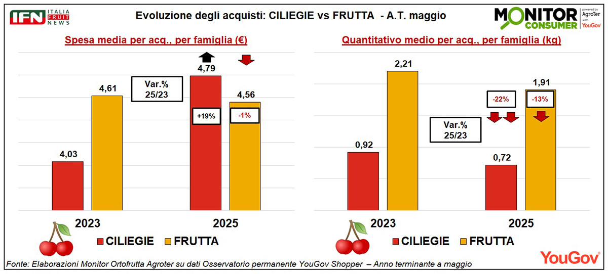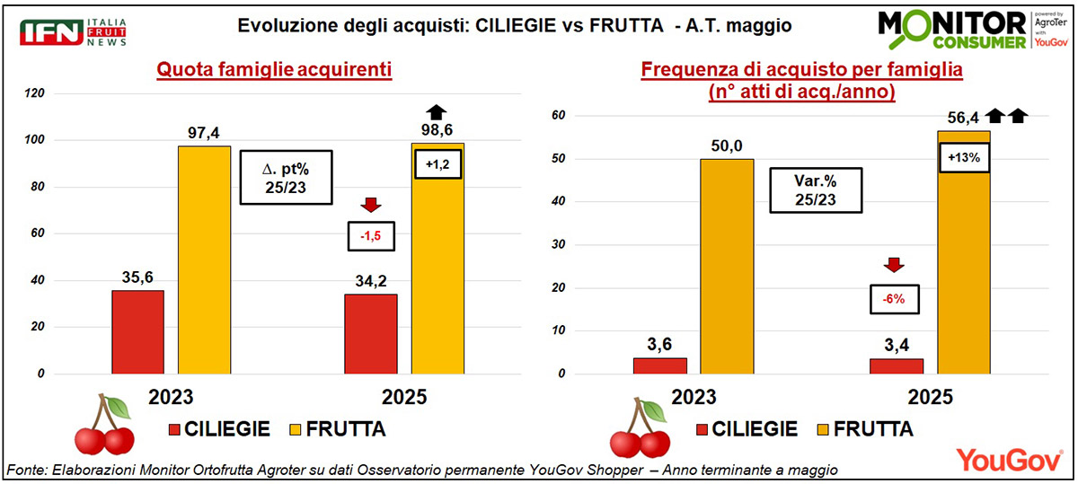La finestra stagionale per l’acquisto di ciliegie italiane è tra le più brevi dell’intero comparto ortofrutticolo nazionale, il che incide negativamente sulla frequenza d’acquisto. Nel 2025 si contano in media 3,4 atti d’acquisto per famiglia, in diminuzione del 6% rispetto al 2023, mentre la frequenza per la frutta in generale è in aumento (+13%).
