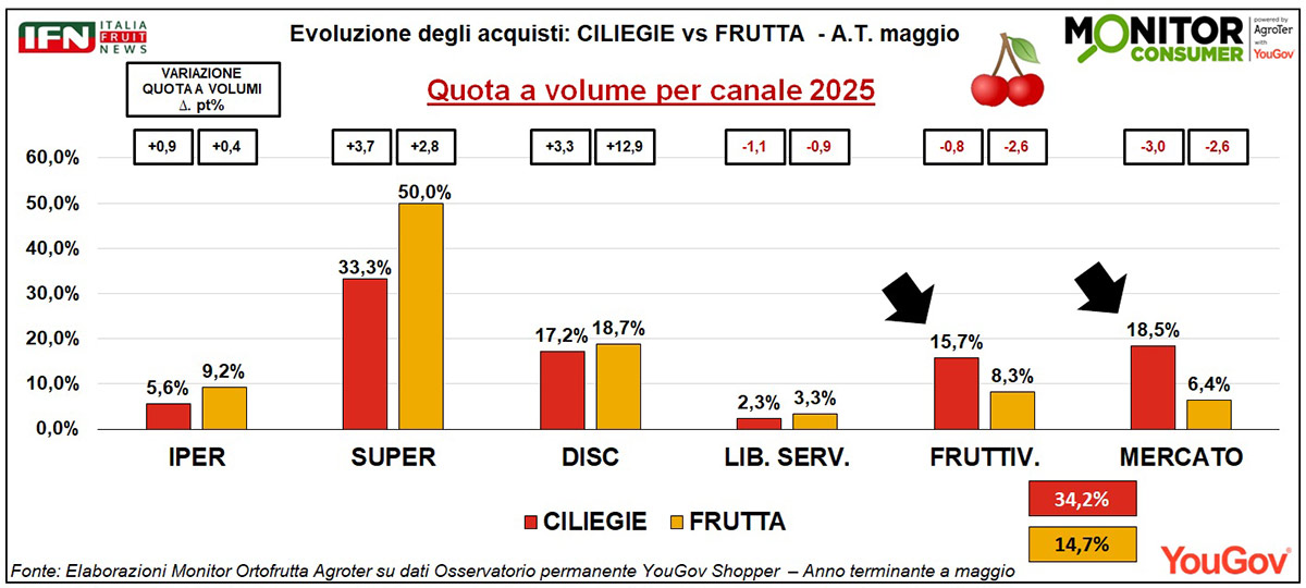 Nell’analisi delle quote per canale di acquisto, spicca il ruolo centrale dei canali tradizionali, che mostrano lo scostamento più marcato rispetto alla frutta nel complesso tra tutti i prodotti analizzati finora. Per le ciliegie, infatti, la quota di acquisti complessiva di fruttivendoli e mercati supera il 34%, mentre per la frutta in generale si ferma sotto il 15%.