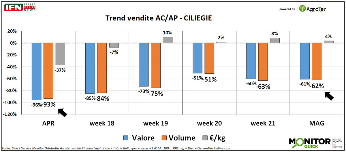 Maggio è il mese in cui le vendite di ciliegie solitamente cominciano a decollare. Ma non quest’anno: i trend nella Gdo sono pesantemente negativi in tutti i canali di vendita, sia a valore sia a volume e nell’ordine del -90% ad aprile e -60% a maggio, oltretutto con una limitata crescita dell'euro-chilo nell’ultimo periodo (+4% a maggio).