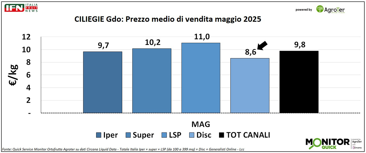 Il crollo dei trend è legato a problemi produttivi che hanno ridotto la disponibilità di prodotto. Tuttavia, come visto, l’aumento dei prezzi non è così marcato rispetto allo scorso anno. Resta il fatto che, per esempio a maggio, il prezzo medio delle ciliegie vendute nella Gdo sfiora i 10 euro al chilo, quindi con valori marcatamente superiori rispetto alla frutta in generale. Questo mix, ovvero poco prodotto disponibile e prezzi alti, ha incrinato pesantemente le performance della categoria.