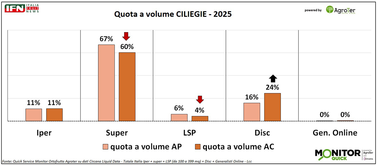 Analizzando le quote a volume delle ciliegie vendute da gennaio alla week 21, infatti, emerge una netta flessione per supermercati e libero servizio, mentre il discount guadagna terreno, registrando un incremento di ben 8 punti di quota. (bf)