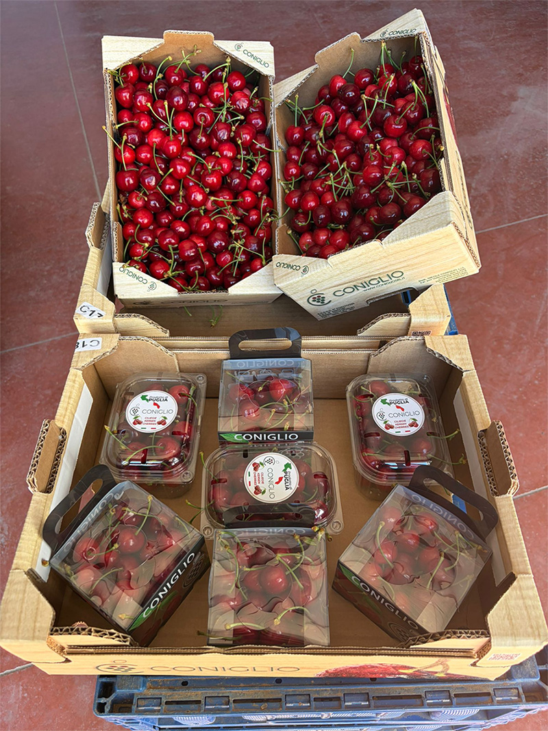 L’azienda Dott. Nicola Coniglio rappresenta il braccio commerciale dell’Op Terranostra, realtà che coltiva ciliegie su circa 250 ettari. “Parliamo di una produzione di circa 11 mila quintali, con un calendario varietale che copre l’intero periodo, dal precoce al tardivo, nelle diverse zone produttive – precisa Coniglio –. Partiamo ora con Bigarreaux, poi proseguiremo con Giorgia e Grace Star, quindi con Ferrovia, Lapins, Kordia e Regina, fino a metà giugno circa. Questo ci consente di garantire un’offerta costante lungo tutta la stagione”.