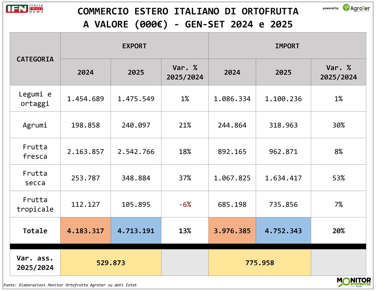 Sul fronte opposto, le importazioni continuano a correre. Tra gennaio e settembre aumentano del 7% a volume, superando i 3 milioni di tonnellate, mentre la spesa complessiva raggiunge i 4,75 miliardi di euro (+20%). Anche in questo caso è la frutta secca a incidere maggiormente: +19% a volume e +53% a valore. A seguire, agrumi e legumi e ortaggi, con un aumento dei volumi importati del 9% e un balzo della spesa per gli agrumi pari al +30%. La frutta tropicale cresce del 5% nei volumi e del 7% a valore, mentre la frutta fresca segna un lieve calo dei quantitativi (-2%). Tuttavia, i prezzi elevati pagati all’origine portano comunque a un incremento dell’esborso (+8%).