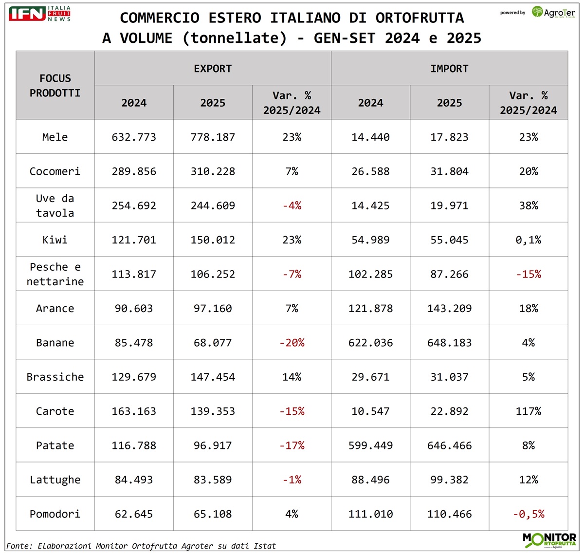 Tra le orticole, le brassiche segnano un +14% nei volumi esportati, anche se l’aumento a valore si limita a 10 punti percentuali. I pomodori mantengono un trend positivo (+4% a volume, +8% a valore). Carote e patate, al contrario, subiscono una fase di contrazione: le esportazioni calano rispettivamente del 15% e del 17%, con le patate che registrano addirittura una perdita del 36% a valore. Sul fronte dell’import spicca infine il caso delle carote straniere, i cui volumi in entrata sono più che raddoppiati (+117%), seppur acquistati a prezzi inferiori, come indica l’aumento più contenuto a valore (+28%).