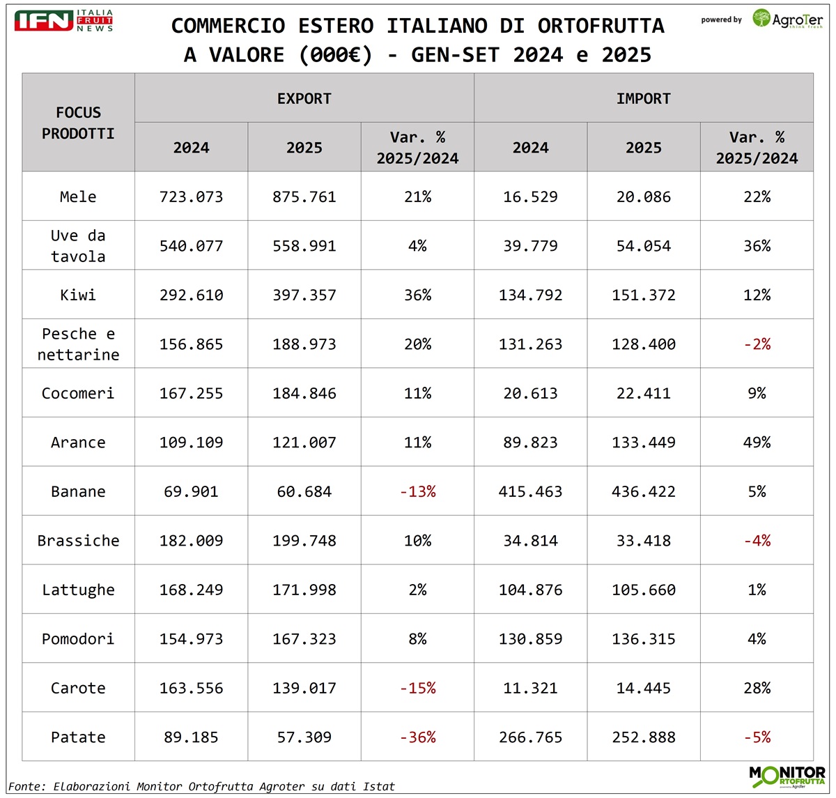 Il bilancio del commercio ortofrutticolo nei primi nove mesi dell’anno offre una fotografia chiara dell’andamento delle diverse campagne. Le mele rimangono la punta di diamante dell’export ortofrutticolo italiano, con una crescita del 23% nei volumi e del 21% a valore. Ottimo il risultato anche per il kiwi, che registra il miglior incremento monetario del periodo (+36%) grazie a volumi in aumento del 23%. Bene i cocomeri, che si avviano a chiudere una stagione positiva (+7% a volume, +11% a valore), così come le arance (+7% nei volumi e +11% nel valore generato). In difficoltà invece l’uva da tavola: i quantitativi esportati scendono del 4%, ma l’aumento dei prezzi consente una crescita a valore del 4%.
