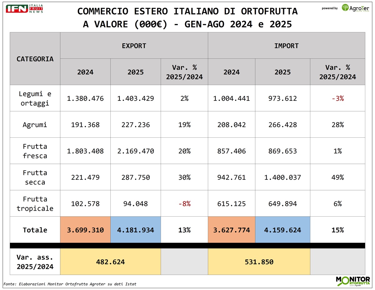 Nei primi otto mesi del 2025 l’Italia esporta 2,58milioni di tonnellate di ortofrutta, pari a un +4% sullo stesso periodo dell’anno precedente, mentre il valore sale a 4,18 miliardi, con un incremento del 13%. La crescita risulta trasversale ma più intensa per alcuni comparti.