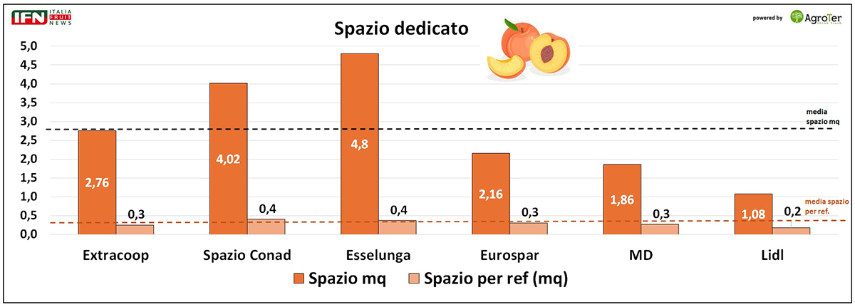 Tuttavia, lo spazio medio per referenza risulta leggermente inferiore a meloni e ciliegie. Questo perché, a differenza di queste due categorie, l’assortimento di pesche e nettarine è più ampio, il che porta a evitare una sovraesposizione delle singole prestazioni.