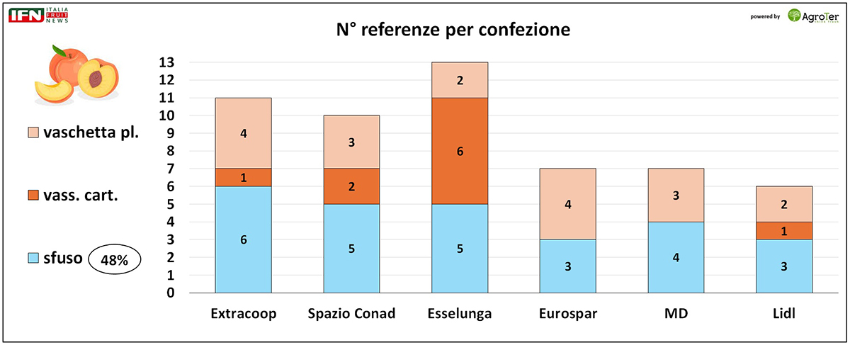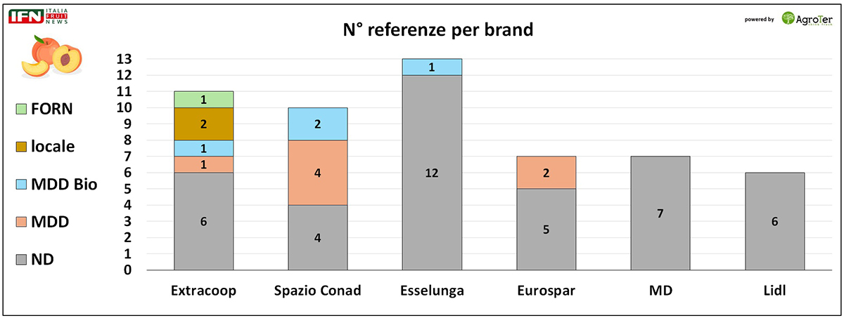 L’analisi mette in luce un elevato potenziale per la categoria pesche e nettarine, dove il 74% delle referenze risulta privo di marchio.