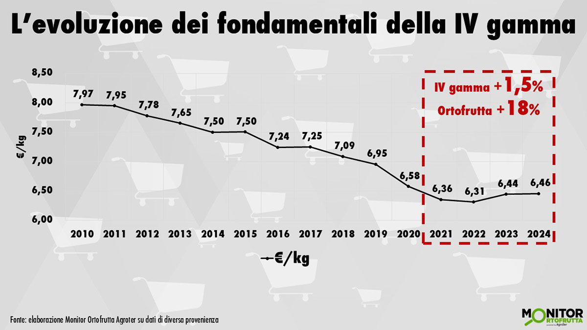 Le aziende all’avanguardia che propongono innovazione, ricerca e applicazioni sembrano però trovare terreno più fertile sul mercato estero. Ma quale scenario si delinea in Italia? L’analisi dell’evoluzione della IV gamma negli ultimi quindici anni racconta un fenomeno articolato. Dal 2010 al 2020 il prezzo medio al pezzo è diminuito fino a toccare i livelli minimi, con una ripresa timida solo negli ultimi anni, fino ad arrivare a 1,31 €/pezzo nel 2024. Parallelamente, le grammature sono aumentate, superando i 200 grammi medi a confezione. Il risultato? Un euro-chilo in costante diminuzione che registra solo una crescita dell’1,5% negli ultimi quattro anni, che non riesce a tenere il passo con quella del comparto ortofrutticolo nel suo complesso (+18%). Quindi è chiaro come ci sia un grande problema di valore.