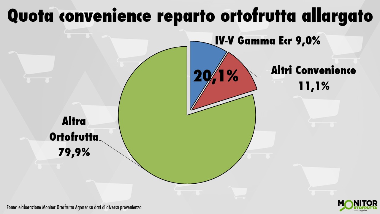 Nel panorama della Distribuzione moderna, i prodotti convenience in ortofrutta si confermano una delle leve più promettenti per la crescita del comparto in Gdo. Considerando il reparto frutta e verdura nella sua accezione più allargata, ovvero il perimetro fisico che oggi ormai comprende diverse categorie non previste dalla classificazione ecr, i prodotti convenience rappresentano oggi poco più del 20% delle vendite complessive, di cui meno della metà di questi composto dalla IV-V gamma (9%), entrambe quote limitate rispetto alle potenzialità dei prodotti ad alto livello di servizio rispetto all’evoluzione dei responsabili acquisti.