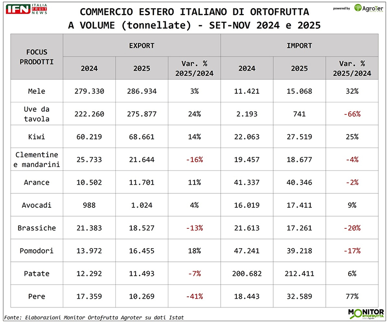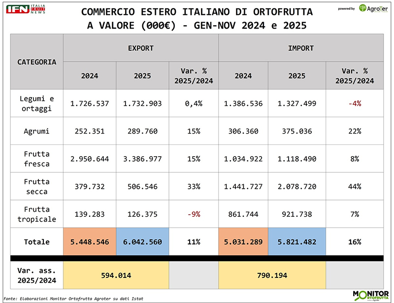 L’export cresce, ma l’Italia “perde” saldo: è questa la fotografia che emerge dalle elaborazioni del Monitor Ortofrutta Agroter su dati Istat relative al periodo gennaio-novembre 2025, messe a confronto con lo stesso arco temporale del 2024. Il punto non è tanto la direzione – le vendite oltreconfine aumentano – quanto la velocità: le importazioni corrono abbastanza da ridurre il vantaggio complessivo, soprattutto sul piano economico.