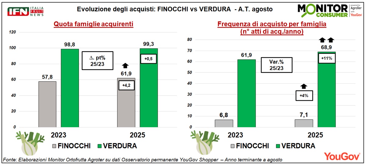 I finocchi sono un prodotto molto diffuso in Italia, acquistato da quasi il 62% delle famiglie, in aumento di 4,2 punti rispetto a due anni fa. Cresce anche la frequenza di acquisto (+4%), che supera ormai i sette atti l’anno, anche se l’incremento risulta meno intenso rispetto a quello registrato per la verdura nel suo complesso (+11%).