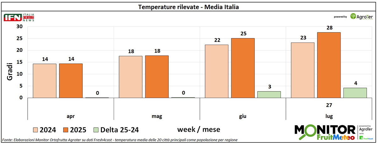 Analizzando lo storico delle temperature dei mesi scorsi, si osserva un sostanziale allineamento con il 2024 nei mesi di aprile e maggio. A partire da giugno, però, si registra un incremento significativo: la temperatura media è salita a 25 gradi, contro i 22 dello stesso mese dell’anno scorso. La prima settimana di luglio prosegue su questa tendenza, con un ulteriore aumento del differenziale, che raggiunge i 4 gradi.