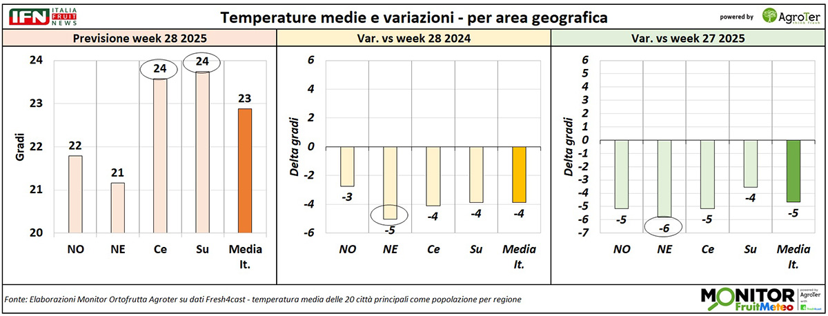 Le analisi del Monitor Ortofrutta si arricchiscono grazie a una nuova collaborazione dedicata a esplorare settimanalmente una variabile spesso decisiva per il settore ortofrutticolo: il meteo. Tra i diversi fattori che influenzano le condizioni climatiche, questa nuova rubrica si concentra in particolare sulle temperature medie registrate lungo la Penisola, con il supporto di Fresh4cast, una piattaforma software in cloud specializzata nella previsione della domanda e nell'ottimizzazione della supply chain per il settore ortofrutticolo.