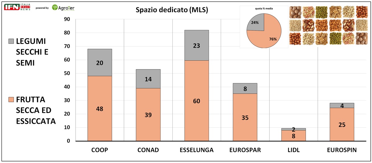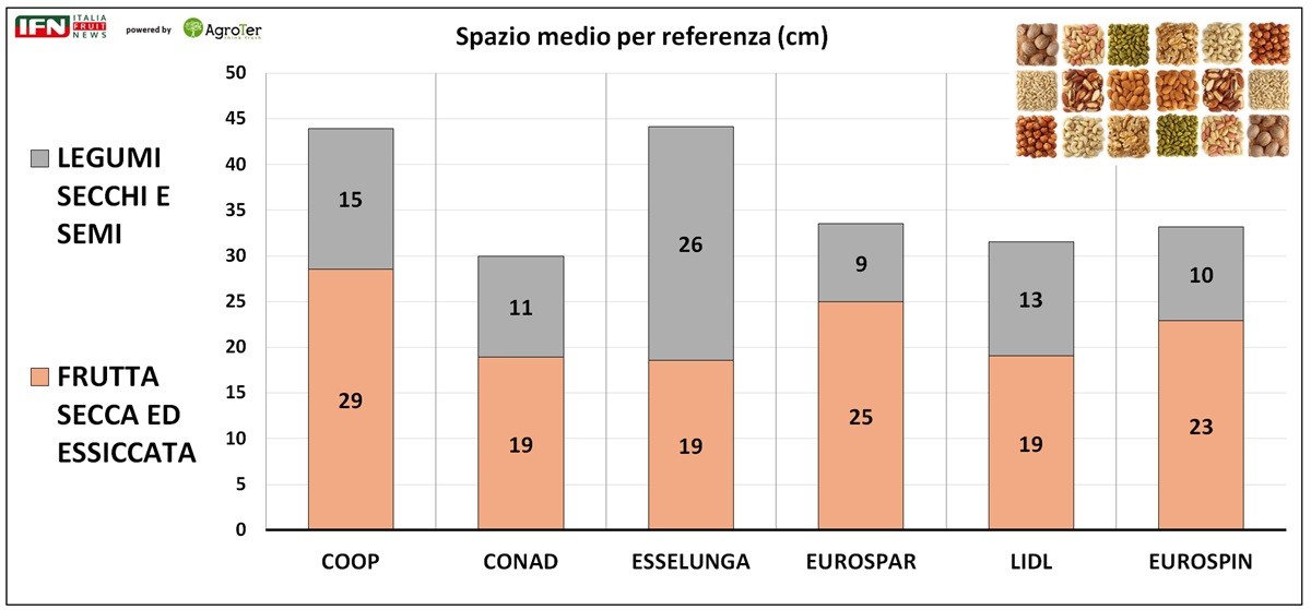 All’interno degli spazi dedicati, la frutta secca consolida ulteriormente la propria centralità: la quota cresce infatti al 76%, lasciando a legumi secchi e semi il restante 24%, un divario che ancora non rispecchia le quote di mercato ma ci sia avvicina di più rispetto alla numerica assortimentale.