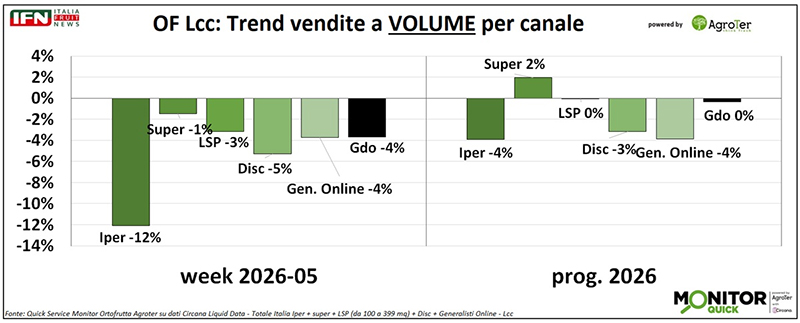 Week 5: +80% a volume, mentre l’ortofrutta Lcc arranca ancora (-4%)