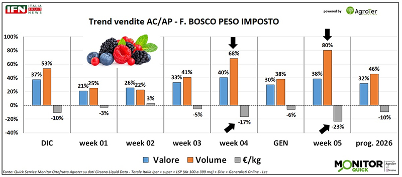 A fronte di un reparto complessivamente in calo, i frutti di bosco evidenziano un andamento diametralmente opposto. Dopo un 2025 positivo, culminato con un dicembre in crescita del 53% a volume, tutte le settimane del 2026 registrano incrementi ampiamente a doppia cifra e un progressivo pari a +46%, con un picco dell’80% nella settimana 5. Il risultato è sostenuto anche da un prezzo medio mix in diminuzione di circa 10 punti, fattore che agisce da ulteriore leva per una categoria già molto richiesta, nonostante un prezzo medio di 14 €/kg, nettamente superiore a quello delle altre categorie.