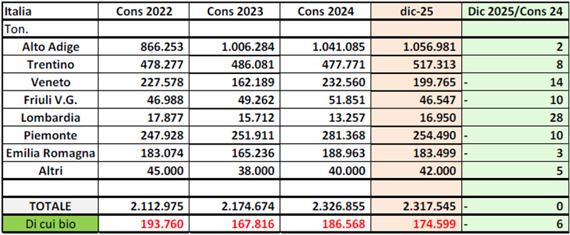 A livello regionale, l’Alto Adige registra un leggero incremento del 2% rispetto all’anno precedente, con 1.056.981 tonnellate, mentre il Trentino cresce dell’8%, arrivando a 517.313 tonnellate. In Piemonte, invece, la produzione diminuisce del 10%, mentre il Veneto, nonostante un calibro generalmente migliore, diminuisce del 14% a causa di alcuni problemi di grandine. Una quota significativa della produzione veneta, pari al 43% del totale, viene destinata all’industria tramite programmi dedicati. L’Emilia-Romagna mostra una produzione leggermente ridotta del 3%, mentre il Friuli registra un calo del 10% e la Lombardia, al contrario, recupera con un aumento del 28%.