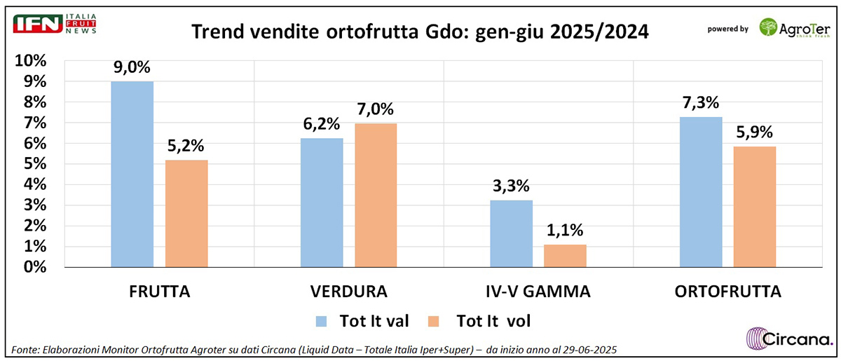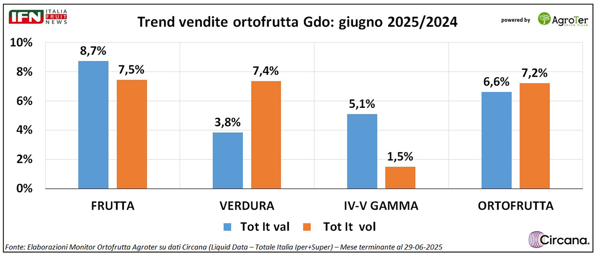 Secondo l’analisi del Monitor Ortofrutta di Agroter, realizzata in collaborazione con Circana, il reparto ortofrutta di ipermercati e supermercati italiani registra a giugno un incremento delle vendite del 7,2% a volume e del 6,6% a valore. La crescita dei consumi è trainata soprattutto da frutta (+7,5%) e verdura (+7,4%), mentre i prodotti servizio mostrano un aumento più modesto (+1,5%).