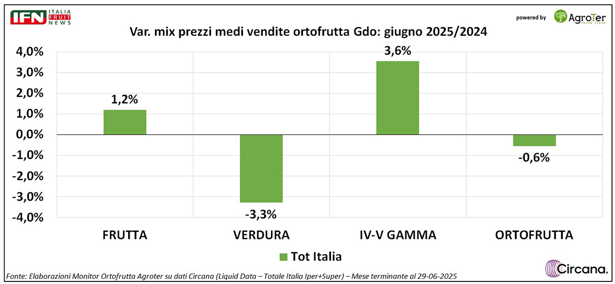 Il risultato positivo di giugno ha inciso favorevolmente sull’andamento progressivo da inizio anno, portando la crescita del reparto ortofrutta al +5,9% a volume e al +7,3% a valore, accompagnata da un lieve aumento del prezzo medio mix. In questo contesto si distinguono la verdura, con un incremento a volume del +7%, e la frutta, che spicca per la crescita a valore (+9%), spinte da dinamiche opposte sul fronte dei prezzi: la verdura continua a essere interessata da una tendenza deflattiva, mentre la frutta è influenzata da un contesto inflattivo, sia a livello di quotazioni sia di prezzi al consumo. Per i prodotti di IV e V Gamma, invece, i trend risultano più contenuti, con un aumento limitato a volume (+1,1%) ma più marcato a valore (+3,3%), sostenuto da un incremento di circa 2 punti nel prezzo medio mix. (bf)