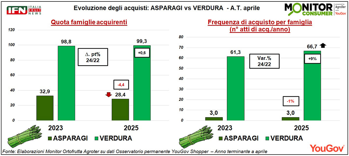 Anche la frequenza d’acquisto evidenzia un trend negativo: -1% per gli asparagi, contro un +9% registrato per la verdura in generale. I soli 3 atti di acquisto medi, tuttavia, sono un dato fortemente influenzato dalla breve stagionalità del prodotto italiano, concentrata soprattutto in primavera.