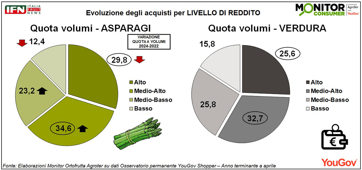 Quota a volume per fascia di reddito: chi guadagna di più predilige gli asparagi