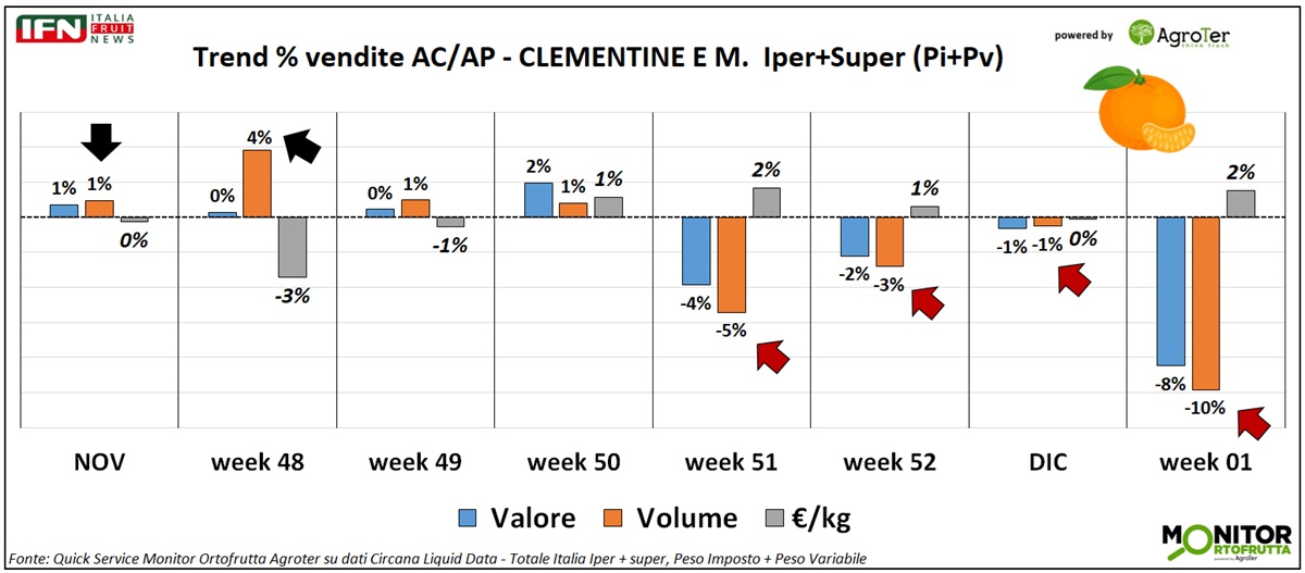 Nei mesi invernali le categorie agrumicole occupano stabilmente le prime posizioni nel ranking delle vendite, ma sono anche le più esposte a squilibri legati alla disponibilità di prodotto o a rallentamenti della domanda, con effetti sulla controcifra anno su anno. È quanto accaduto a clementine e mandarini, caratterizzati da una campagna poco esaltante: dopo una lieve crescita dei volumi in ipermercati e supermercati tra novembre (+1%) e l’inizio di dicembre (week 48 +4%, week 49 e 50 +1%), da metà mese il trend ha invertito la rotta (week 51 -5%, week 52 -3%), portando l’intero mese di dicembre in lieve flessione (-1%), e registrando un peggioramento nella prima settimana dell’anno (-10%).