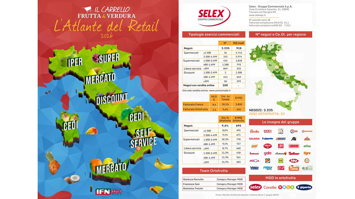L’Atlante conterrà 70 schede dettagliate, con una panoramica che spazia dalla rete vendita — icluse insegne, format, dimensioni e localizzazione regionale, comprese le strutture dei Ce.Di. — fino a una sezione dedicata alle performance del reparto ortofrutta e alla struttura dei team, con focus sulle Marche del Distributore utilizzate nel comparto.