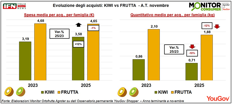 Sul fronte della spesa media, gli italiani hanno destinato più risorse al kiwi (+12%), mentre hanno leggermente ridotto quella per la frutta in generale (-1%). Una dinamica che si riflette anche nei quantitativi medi per atto d’acquisto, in calo sia per la frutta (-12%) sia per il kiwi, ma con una flessione più moderata (-10%).