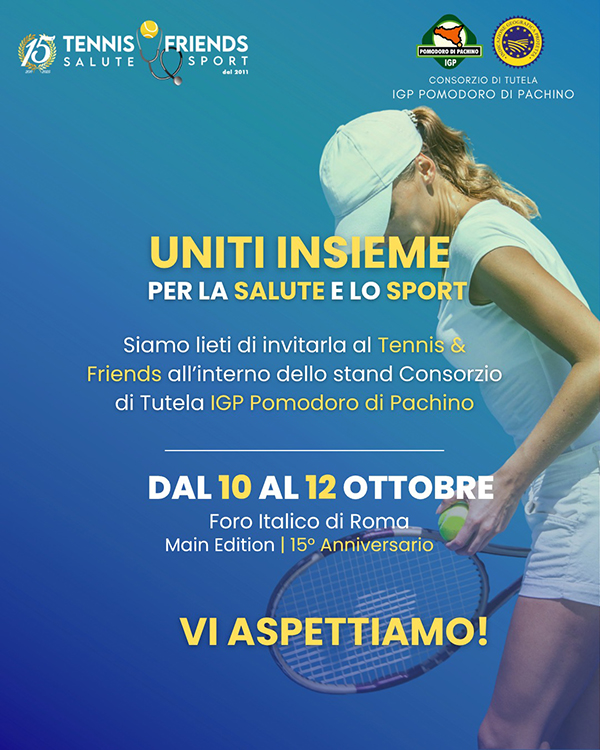 Il Consorzio di Tutela della IGP Pomodoro di Pachino scende in campo per la salute e anche questa volta lo fa da un palco d'eccezione, quello del Tennis and Friends al Foro Italico di Roma. Un connubio tra sapore, sport e benessere che segnerà la partecipazione dell'oro rosso di Sicilia alla nota kermesse tennistica dedicata a salute e prevenzione. Grazie alle sue proprietà antiossidanti, antinfiammatorie e antitumorali, all'alto contenuto di licopene e vitamine A e C, questo frutto unico rappresenta, infatti, un alleato ideale per il benessere e la salute di tutti, un concentrato di energia perfetto per affrontare le fatiche dello sport.
